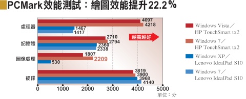 此外,由於Lenovo並未提供Windows 7驅動程式,導致我們無法在Windows 7環境下,順利以S10執行PCMark的圖像處理測試。但在使用內建AMD整合型顯示晶片的tx2測試時,僅安裝AMD Beta版驅動程式的Windows 7,圖像處理能力還比Vista提升了22.2%。