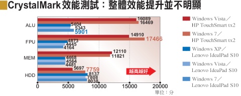 在效能方面,Windows 7相較於Vista或XP,都略有提升。從S10和HP TouchSmart tx2(以下簡稱tx2)這2款不同等級的筆記型電腦,搭配2種測試軟體的結果中,可以看出Windows 7明顯提升了硬碟效能,幅度最高達到17.6%。