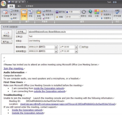 在OCS管理架構下想要建立一個視訊及語音會議有4種方式,較常見的是直接透過OC2007或Live Meeting等個人端程式,點選連絡人名稱後,啟動這項功能即可,操作的方式和Skype或MSN Messenger並沒有什麼不同;也可以利用Outlook事先排定會議時間,並發送邀請通知與會者,屆時只要點選通知上述信件中的連結就能加入會議。