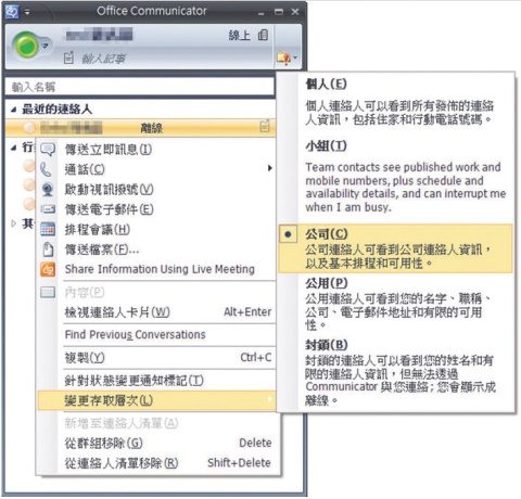 除了身分的不同,OCS管理員也能限制會議的安全層級。舉例來說,我們可以將會議設定為封閉式驗證(Closed Authenticated)模式,如此一來將只有內部使用者能加入,處於企業防火牆外的使用者,即使具備合法驗證,也不能參與這場會議。所有以封閉式驗證模式召開的會議,組織者、主持人和與會者的權限也都必須預先設定,無法隨意更改。