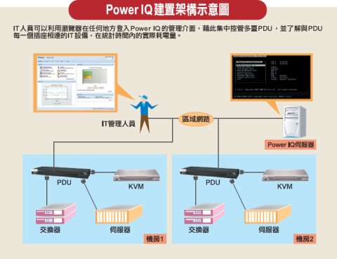 以Raritan Power IQ來說,它就是一套可以收集各臺PDU設備的供電資料,並集中控管、檢視的軟體。它可以同時監控多臺電源分配器,IT人員可以藉此將分散於各地的PDU設備集中控管(最多可同時管理1千臺),並透過這套軟體的報表功能,擬訂電力配置方案,像是控制機房冷卻系統的輸出功率在適當範圍,在電費與系統穩定性之間取得平衡,而不是一味地降低溫度,造成過度冷卻及電力浪費。也可以透過電流和電壓的統計資料,了解目前機房的供電系統是否足夠,或是伺服器的待機與工作時間比率等,並作為調節機房設備數量的參考。