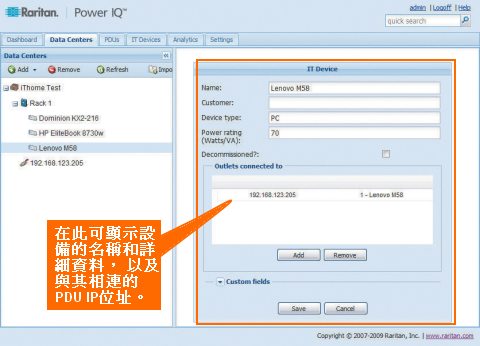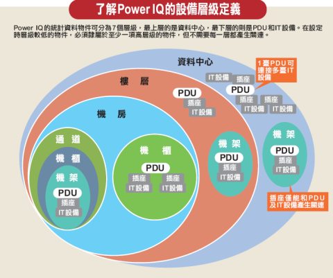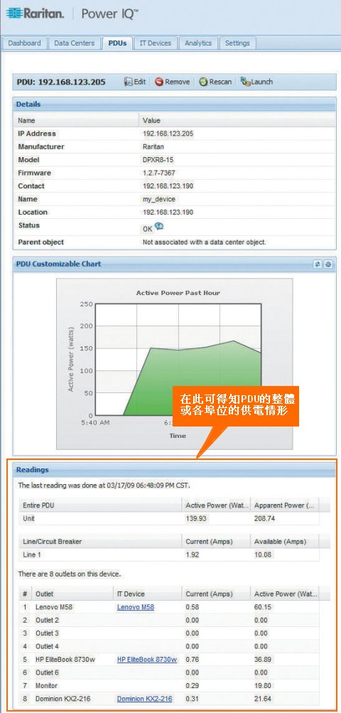Power IQ目前最新的版本為1.3,它支援多國語言,並新增了報表與分析機制,還能同時管理多種不同廠牌的PDU設備。除了Raritan的Dominion PX系列外,也能監控APC、HP、Eaton、Geist或ServerTech等廠商的PDU或CDU(Combine Distribution Unit)。如果搭配Raritan的Dominion PX系列PDU,還能將電源監控的層級擴展至單一IT設備,管理得更為精確,而不像過去僅能得知公司總耗電量,或是每一臺PDU設備的總耗電量。