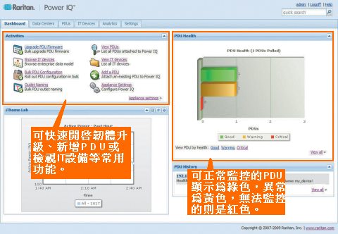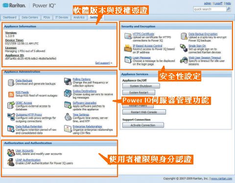 我們在瀏覽器的網址列輸入Power IQ伺服器的IP,就能直接進入它的管理介面,由於分類和版面配置都很簡潔,加上光看名稱不容易了解的功能按鍵旁,也都加上了說明或註解,因此使用起來相當容易。