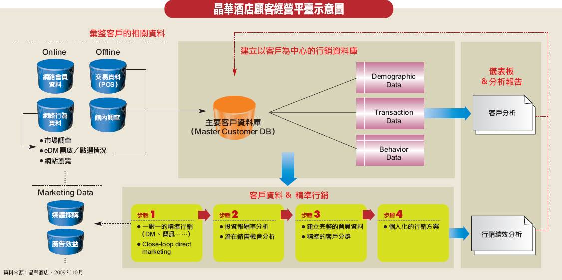 去年,金融海嘯爆發後,晶華酒店的消費族群也開始有了大幅改變,原本有高達8成是國外商務客入住的態勢急轉直下,晶華酒店為了精準掌握消費結構轉變,決定導入客戶關係管理(CRM)平臺。今年初,系統正式上線之後,更開始進行各種資料分析,結果發現晶華酒店的餐飲消費中,主要的消費客戶群是年收入50萬元左右的中產階級,而非原本想像中的白領階級。這個發現不僅讓晶華酒店當頭棒喝,也讓晶華酒店發現新的消費客群。
