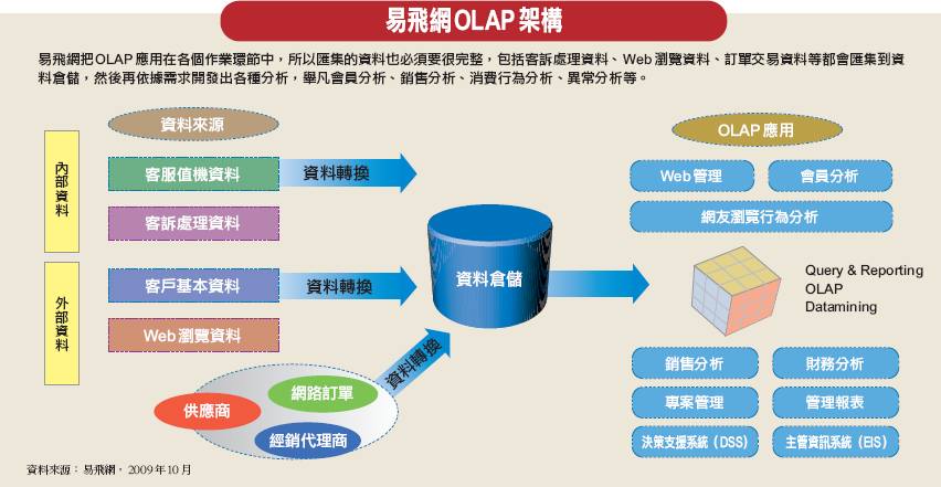 對於易飛網而言,OLAP是即時調整商業策略的一項武器,除了可以讓相關人員進行各種交叉分析,找出營運的利基點與經營弱勢之外,也可根據分析結果,即時調整產品線內容或作業流程企業透過客戶關係管理尋找經營契機