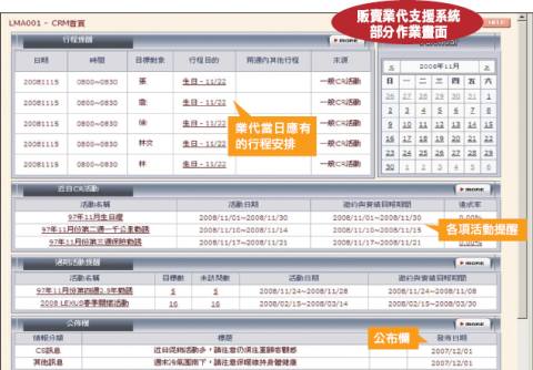 每天早上業務接待人員登錄系統之後,系統就會自動提供需要聯絡的客戶名單,業務接待人員只要點選客戶名稱後,該客戶的相關資料,包括個人基本資料以及往來記錄等資料系統都會自動帶出。