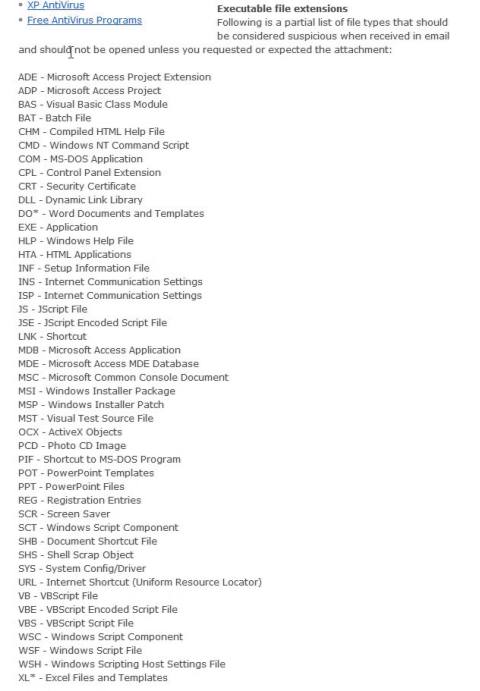 這裡有一個「可執行檔案」的副檔名列表,看到這類副檔名就要小心了,有害的東西就可能藏身於其中。執行就是最危險的事