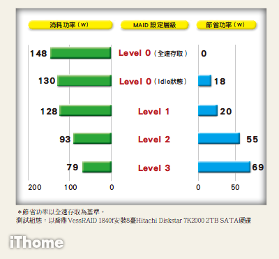 從測試結果可發現,1840f在Spin Down下可節省接近50%的電力,不過此時需要15∼18秒時間才能恢復存取。相較下其他模式的節電效果雖然較不顯著,但恢復全速存取的時間也快得多。