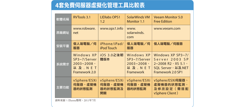 透過第3方的管理軟體,能提供企業在不同需求的情況下,透過適合的方式,管理內部的vSphere/ESXi伺服器,及虛擬機器,而這次我們所測試的對象,一共包含部署在一般個人端電腦的RVTools、SolarWinds VM Monitor、Veeam Monitor Free Edition,及使用於iPhone/iPAD平臺的OPS1等4套常見的免費管理軟體。