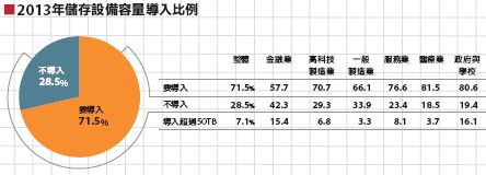 企業在2013年的儲存投資,仍以基礎建設相關設備為主,有41.4%企業儲存投資以磁碟陣列採購為主,另外NAS(網路附加儲存)設備、備份軟體和儲存虛擬化(31.5%),也都有超過3成的企業有計畫採購。