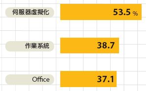 今年伺服器虛擬化仍位居企業軟體投資第一名,占比53.5%,遠高於作業系統、Office等辦公室軟體投資。金融業對伺服器虛擬化的需求最高,有高達近7成的金融業要投資伺服器虛擬化,其次包括政府與學校、醫療業等,今年也都有過半機構編列了伺服器虛擬化預算。
