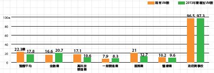 政府與學校建置虛擬機器的規模最高,2013年預計要增加近百臺(97.3臺)虛擬機器。其次則是金融業。