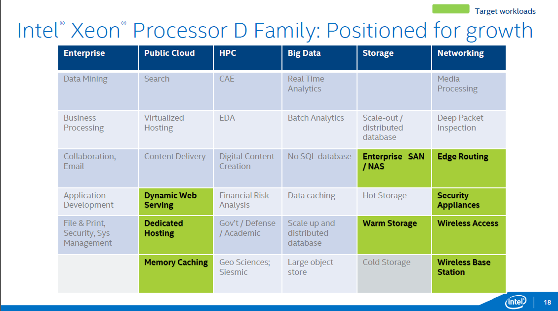從Intel提供的資料中可看出,這系列處理器是針對公有雲、儲存,以及網路等應用所推出,包括公有雲環境的動態網頁服務(Dynamic Web Serving)、記憶體快取(Memory Caching)、儲存應用的SAN/NAS與溫儲存(Warm Storage),以及網路環境下的邊緣路由(Edge Routing)與安全應用伺服器等。