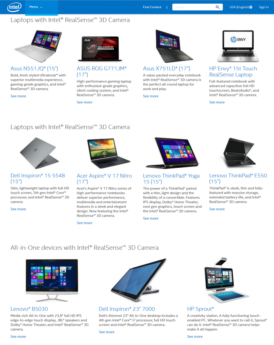 舉例來說,在筆電方面,有宏碁Aspire V 17 Nitro、Dell Inspiron 15 5548、HP Envy 15t Touch RealSense,而華碩已有三款產品,像是ASUS N551JQ、X751LD與ROG G771JM,聯想也有兩款,包括ThinkPad Yoga 15、ThinkPad E550;在AIO一體成型桌上型電腦方面,也有像是聯想B5030、Dell Inspiron 23 7000與HP Sprout這三款,目前5大PC廠商都有推出相關機種。